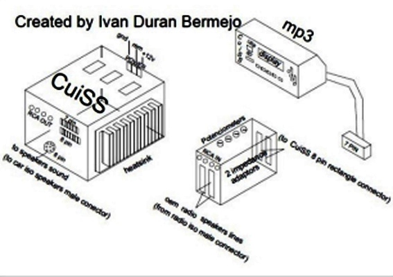 Nuevo sistema de audio que permite el acople de varias señales analógicas al sistema de sonido Oem de cualquier vehículo automóvil. Este sistema es capaz de tratar, potenciar y mejorar la calidad de sonido del sistema Oem. Este interface puede implementar reproducción de archivos desde medios extraíbles como dispositivos USB o tarjetas SD, añadir entradas auxiliares, además de función manos libres para teléfono móvil con reproducción de música en streaming, entre otras funciones adaptables como sistemas multimedia con android, gps, etc. El margen de beneficio es extraordinario incluso con una producción a baja escala.